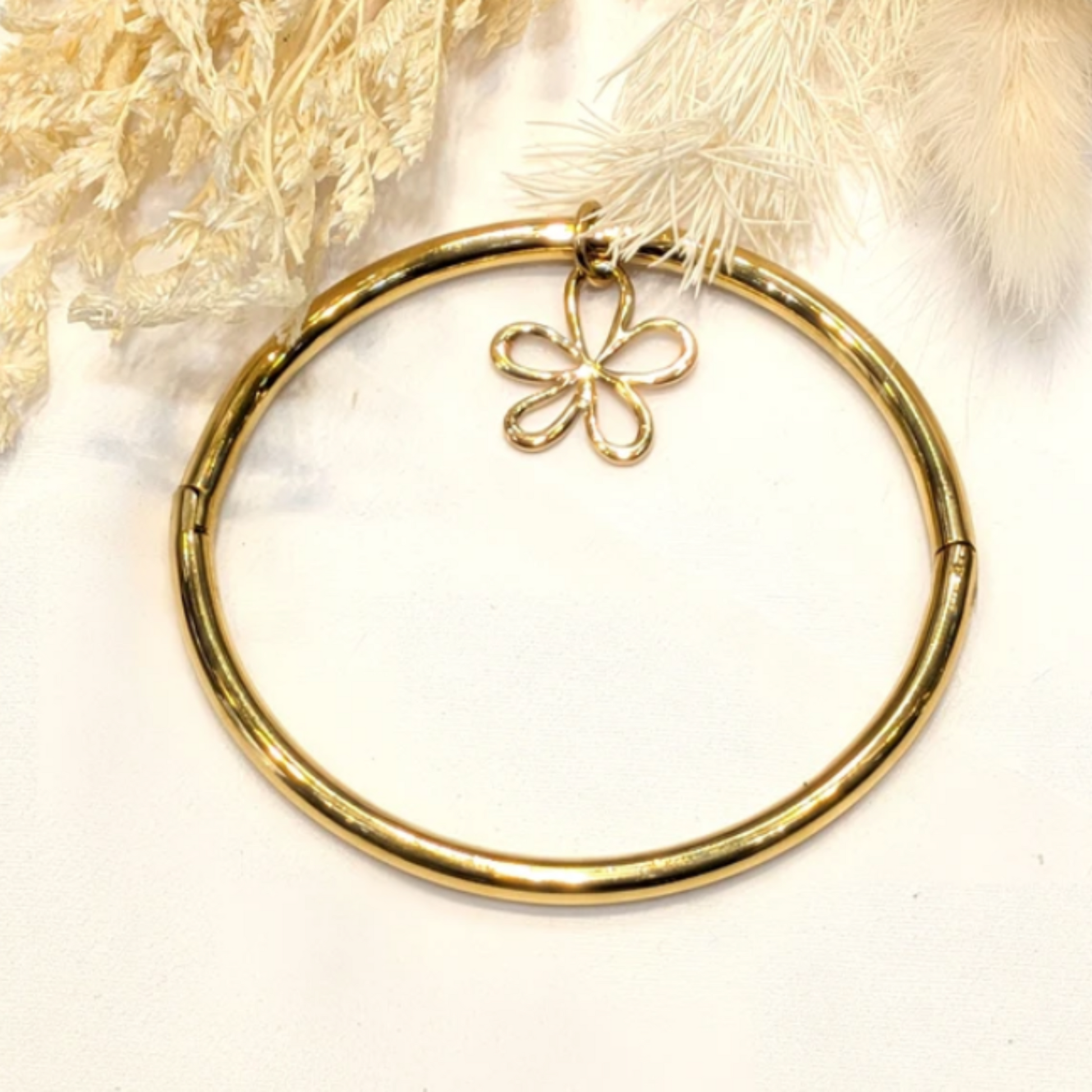 Apportez une touche de fraîcheur et de féminité à votre look avec ce bracelet jonc en acier inoxydable, délicatement orné d’un charm en forme de fleur.